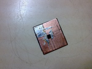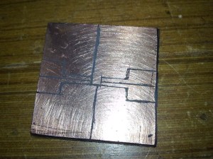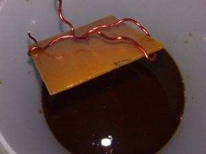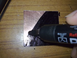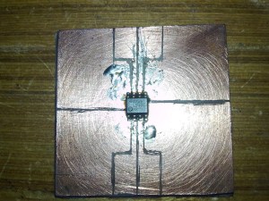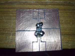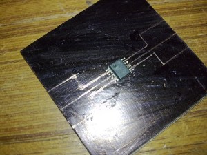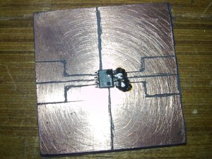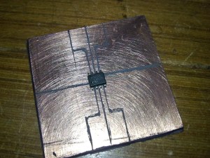 extend the lines further and widen these lines if possible,to allow for use of thru hole components.now prepare the etching solution.I prefer ferric chloride. hold the pcb by means of a ‘holder’ i hav made one out of thick laminated copper wire.dip it into the etching soln.keep stirring continously.sometimes heating may also be required for speeding up the process.after the etching is done and all the bare copper is removed, remove the marker ink using acetone(sold as nail paint remover). your pcb is ready. check for any short circuits between the various parts of the pcb usin multimeter.i kept a small patch of copper shorted with the ground under the pcb to act as a heatsink since this chip has a powerpad at the bottom which is grounded.this power pad help dissipate heat as well as increase the sink/source capability of the chip.