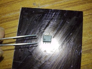first of all hold the chip in place using a tootpick on the prepared PCB. solder just the pin no.1.this helps to keep the chip in place.now now solder the pin no.8. now the rest of the pin are soldered by placing a blob of solder on all the four pins on one side .then the blob maybe sucked out using desoldering braid which leaves only the required quantity of solder on the pad.the process is repeated on the other side as well. check for the continuity between the pads and the pins by a multimeter,once confirmed.proceed to soldering the other components.