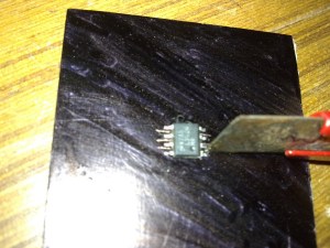 then i drew a few lines between the leads of the chip using the pointed end of one leg of the tweezer as shown.this exposes the copper of the pcb.Here the chip acts as the stencil.the chip can be held in place using an end of a toothpick.