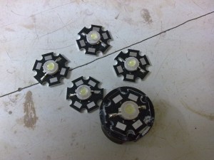Now these LEDs cary a huge amount of power for their size.They generate some heat so heat sinking is required to prevent any damage due to overheating.I got some small heatsinks that could fit in the bulbholders themselves so there’s no need to reengineer the LED mount.the LEDs were ‘stuck’ to the heatsinks by means of heats ink compound.a small container of this thermal compound would suffice and the cost just 10 bucks.i would suggest polishing the surface of the heatsink before applying the thermal paste.It is not necessary though.Just to be on the safer side i polished the surface of the heatsink with some sand paper.a very small amount of thermal paste is applied on the heatsink.so as to form a very thin layer. the LED is the placed on the heatsink and a small amount of force may be applied so as to place the LED firmly in place.this step is repated for all the leds.