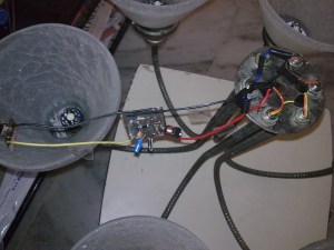 i managed to squeeze the LEDs fitted with the heatsink into the bayonet mountings of the incandescent bulb.this made my job of mounting the LEDs a bit easy.a lot of improvisation might be needed here.i also rewired the whole Luminaire. since the wire was old and was oxidised. i connected the each set of 3 LEDs in series. this gave me 2 strings of 3 series LEDs. i connected these two strings in parallel. i first tested the circuit with the 12v out from an computer SMPS.the yellow wire from the SMPS is the +12v while the black wire is the ground. the test was sucessfull so i proceeded to mounting the circuit.i attached a barrel plug connector to driver circuit so as to allow the connection of a standard wall wart supply. i used a 12v-1amp adapter that was used as a supply for a cordless phone. i mounted the circuit on the wallwart itself with some insulation tape.the supply for the adapter is given from the mains .after testing the circuit for another hour to check the stability i reassembled the luminaire and hung it back up on the ceiling.