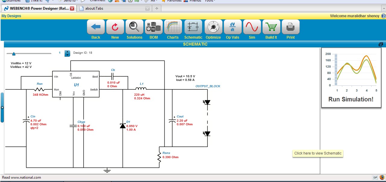 Now i checked out the datasheet of the LM3404,there were a lot of formulae and stuff on how to calculate the values of the various components used in the circuit.I found it difficult to get the accurate values of these components .I was also not too sure about the values being accurate. so i tried out the webench tools from National Semiconductor.These are great free tools from national which help in designing circuits based on their ICs.registration is required to use these tools which is also free. now on the webench designer page for LM3404 there were fields for the forward voltage of the LEDs,forward current,etc.I had no exact values for my LEDs since the guy whom i brought it from just referred to the as chinese made 1w led.So i assumed that it would be having a forward voltage of 3.4v and a current of 350ma.To confirm my assumption i had to check these specs with my multimeter.the volatge across the LED was 3.18v @133ma and 3.32v @210ma.I used a constant current supply mentioned in my provious post on power LEDs to check the voltage across the led.These values also help in determining the Rdyanmic-the dynamic resistance of the LED also known as ESR(equivalent series resistance).usually it is 1-2 ohms for power LEDs. In my case it was 1.81 ohms.The ESR can be calculated by measuring the increase in forward voltage drop dividedby the increase in current. For example, if the forward voltage drop increases by from 3.5V to 3.55V (a 50mV increase) when the forward current goes from 10mA to 20mA (a 10mA increase), the ESR will be 50 mV/10mA=5 ohms.I’ll be using a 12volt-1amp Wall wart from a deceased cordless phone as power souce for the LED driver cicuit.Take a printout of the circuit designed by the webench designer,as you’ll be needing it for further reference.here’s mine. there are 2 strings of three LEDs in parallel at the output block.