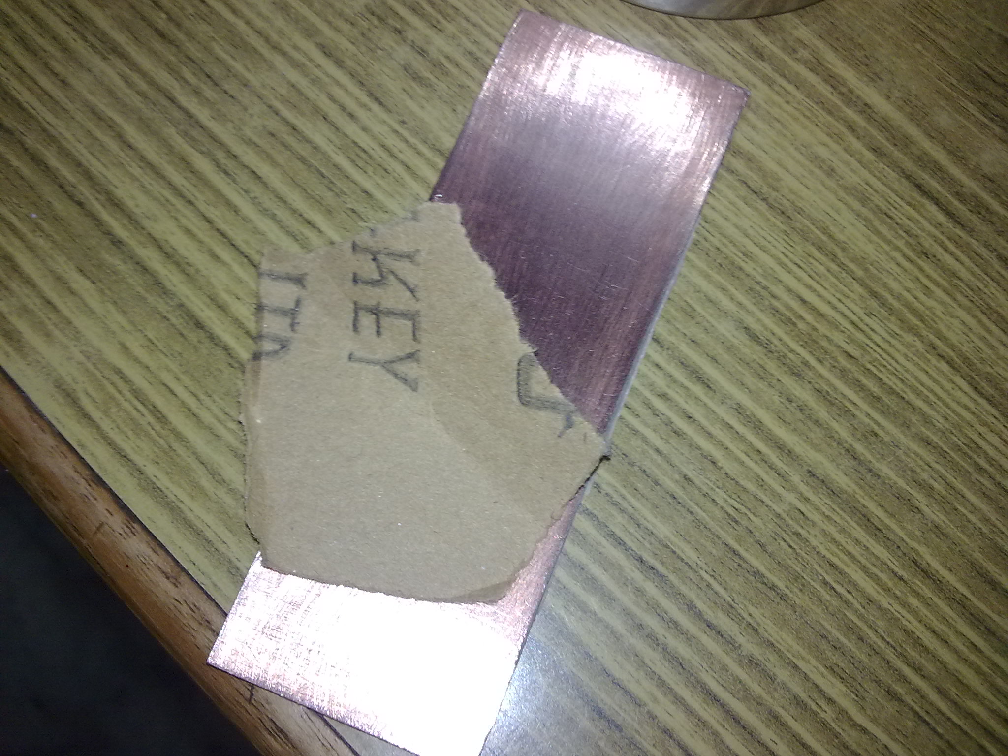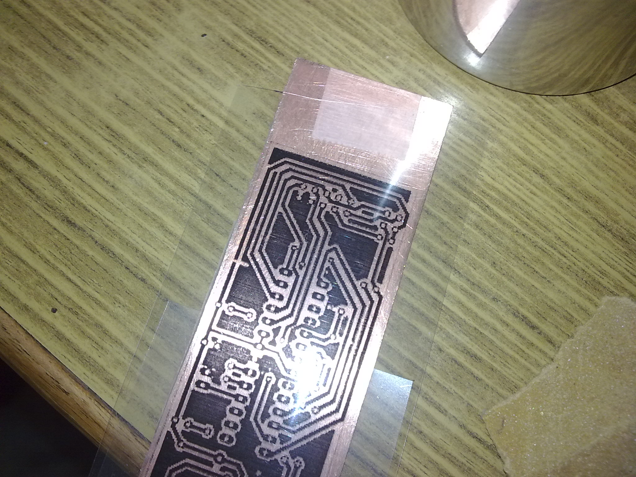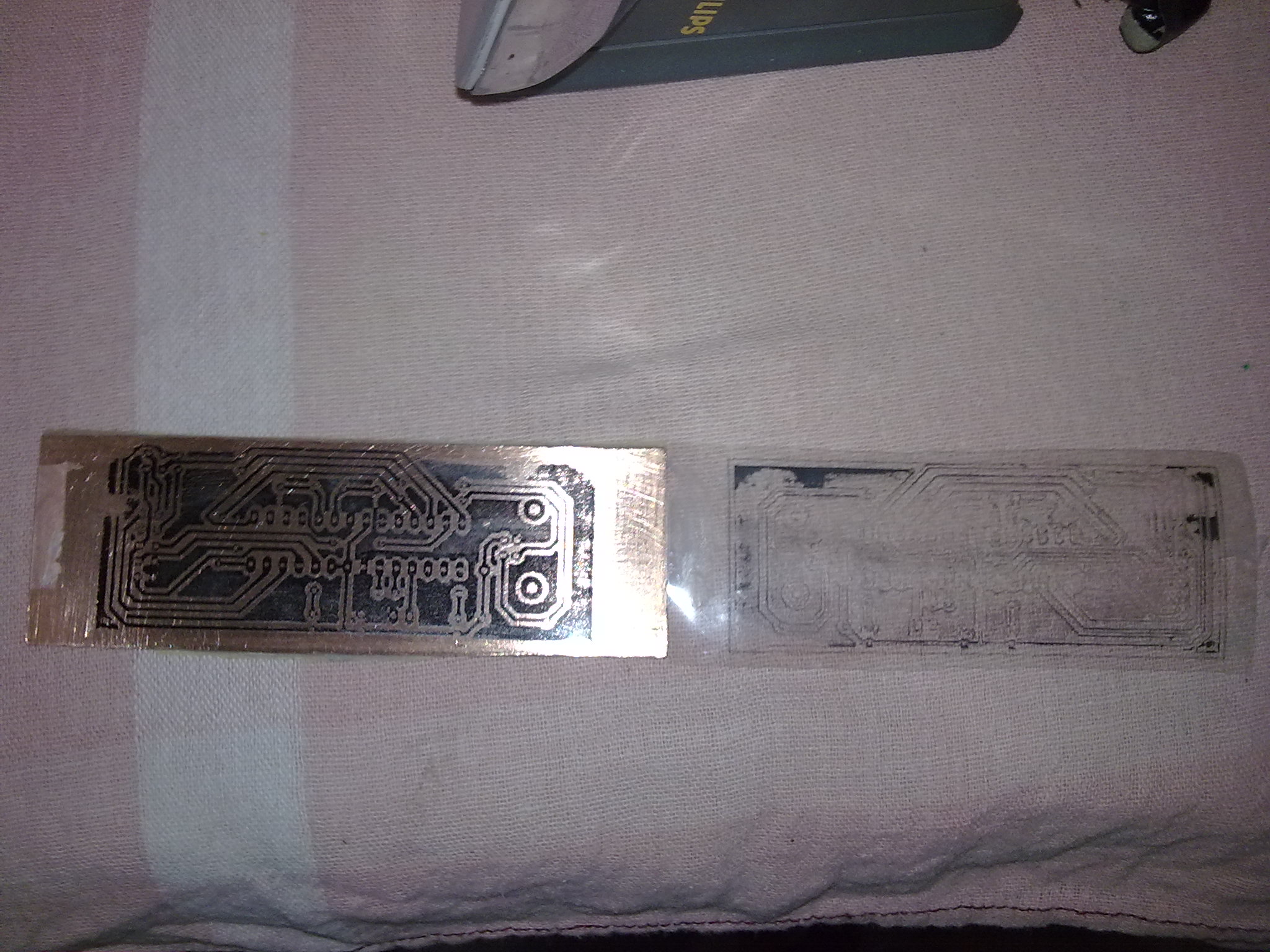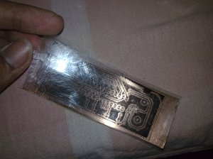 - Peel off the transperency if you got it right then you will see that almost all the toner has been transferred to the copper surface.