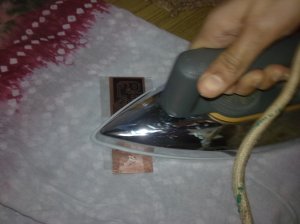- Using a hot clothes iron heat the toner transfer so that the toner layer from the tranfer is transferred onto the copper.(set the iron to the highest temperature possible…usually the cotton settings)