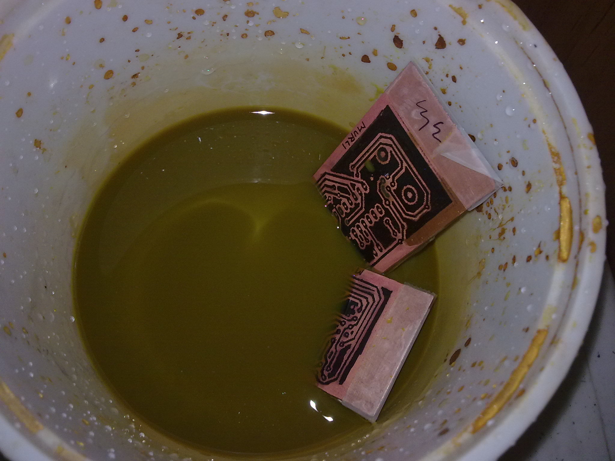 - Gently ‘move’ the copper clad board through the FeCl3 solution.